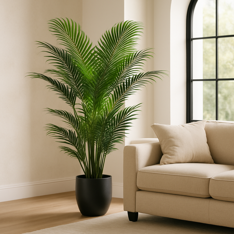 Dans le salon, placez une grande plante artificielle dans un coin pour structurer l'espace, ou disposez plusieurs petites plantes sur une étagère pour créer un effet de végétation naturelle.